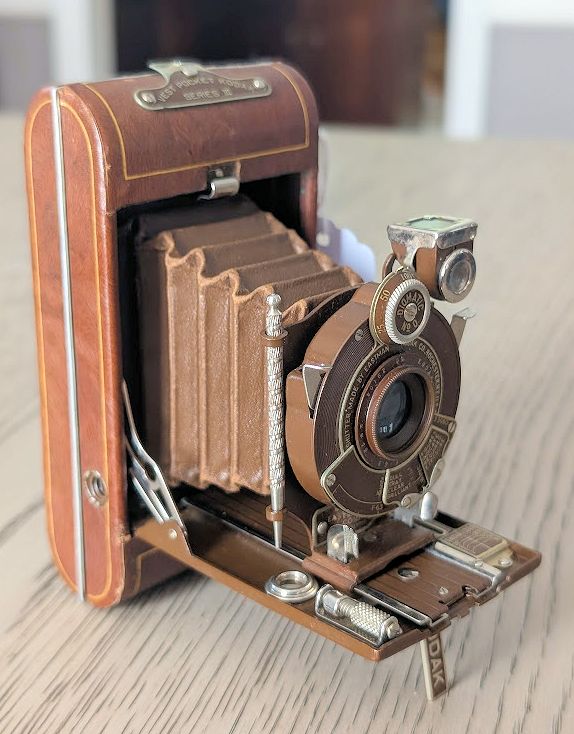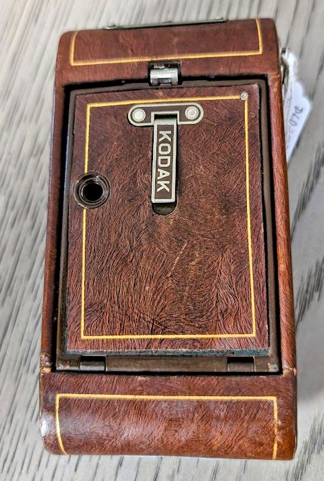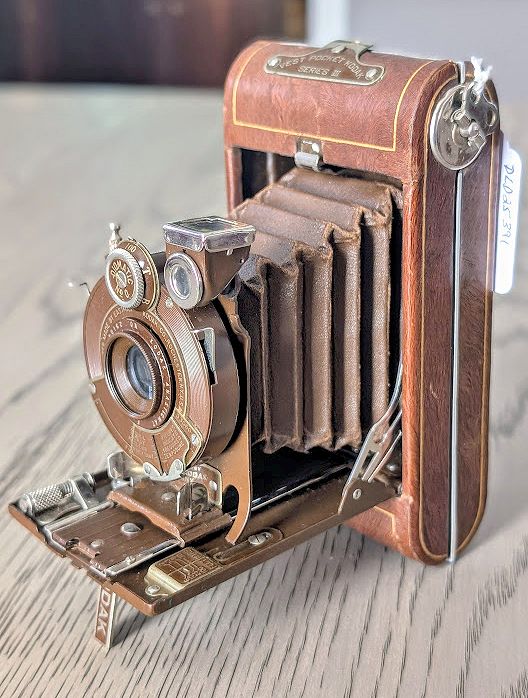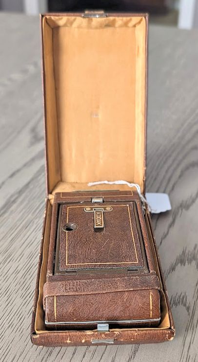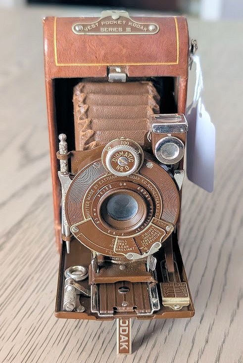 KODAK VEST POCKET SERIES III VANITY WITH CASE (1926-1933) IN JENNY WREN BROWN. Case has a bit of wear and scuffing as shown and strap is broken. Camera is in Fine Condition with only minor wear. $249.00 plus Shipping. NJ Residents add 6.625% Sales Tax.